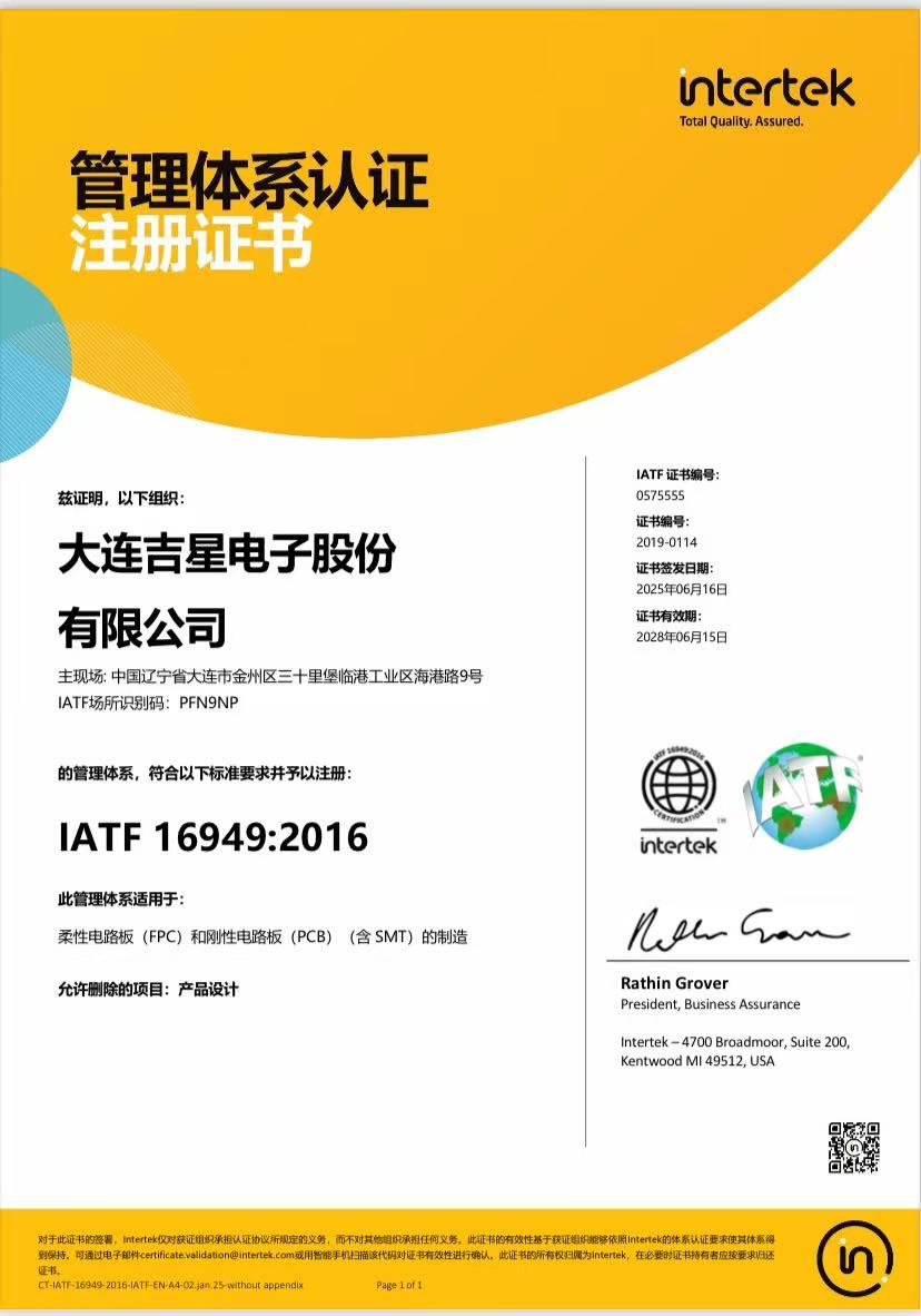 大連吉星電子股份有限公司,成立于1999年,是東北地區專業從事印刷線路板(FPC及PCB)研發、設計、制造和銷售為一體的高新技術企業。公司坐落于風景秀麗的大連市普灣經濟區,工廠總建筑面積50000余平方米。產品具有配線密度高、重量輕、彎折性好等特點,廣泛應用于新能源汽車、平面顯示器、移動通訊、計算機、數碼相機、醫療器械、智能照明等領域。